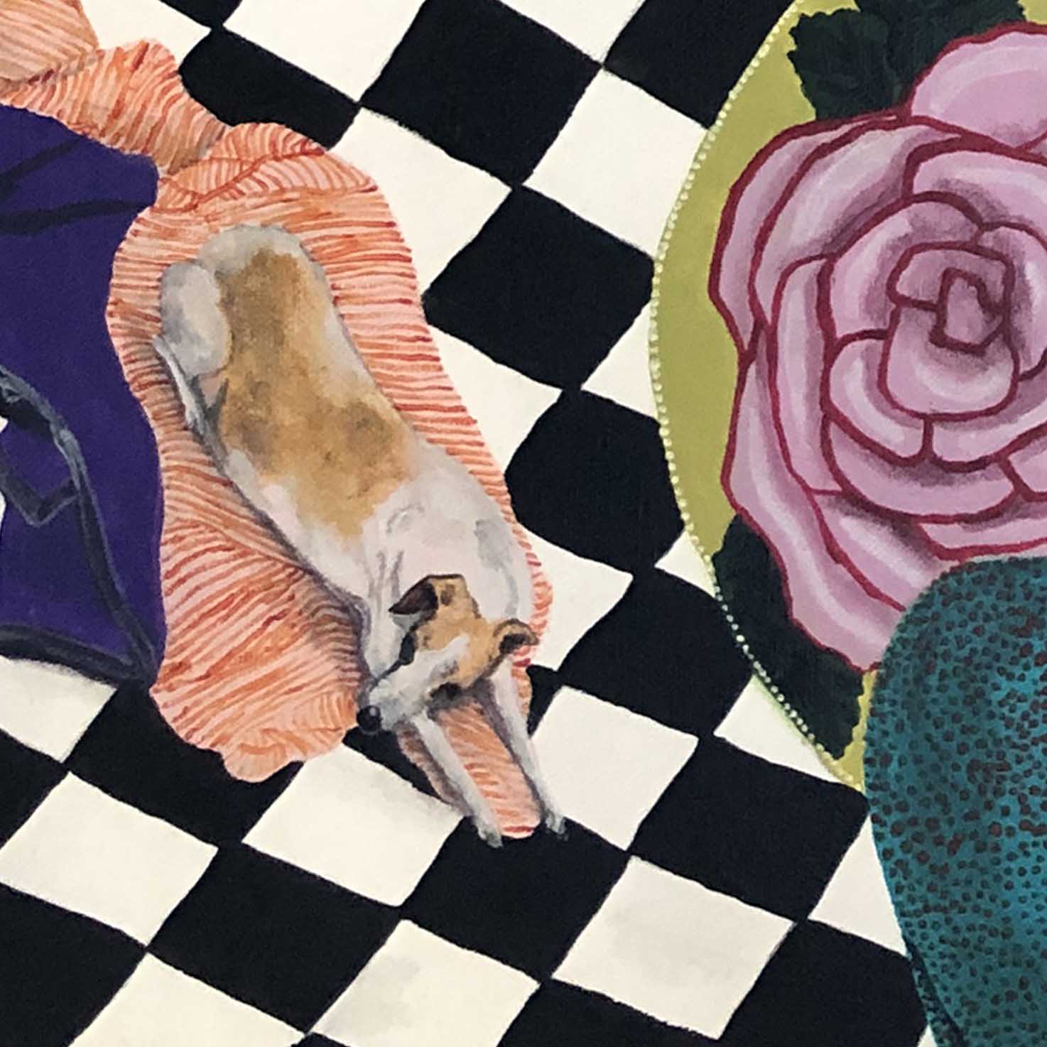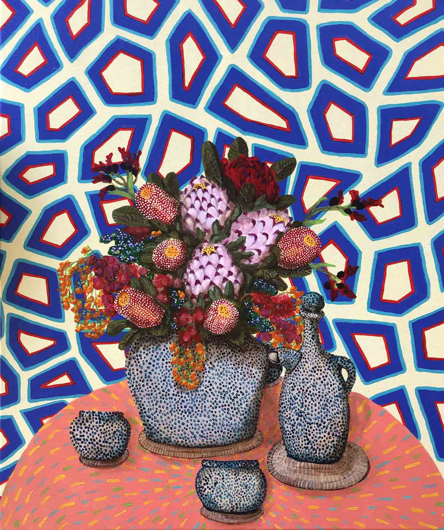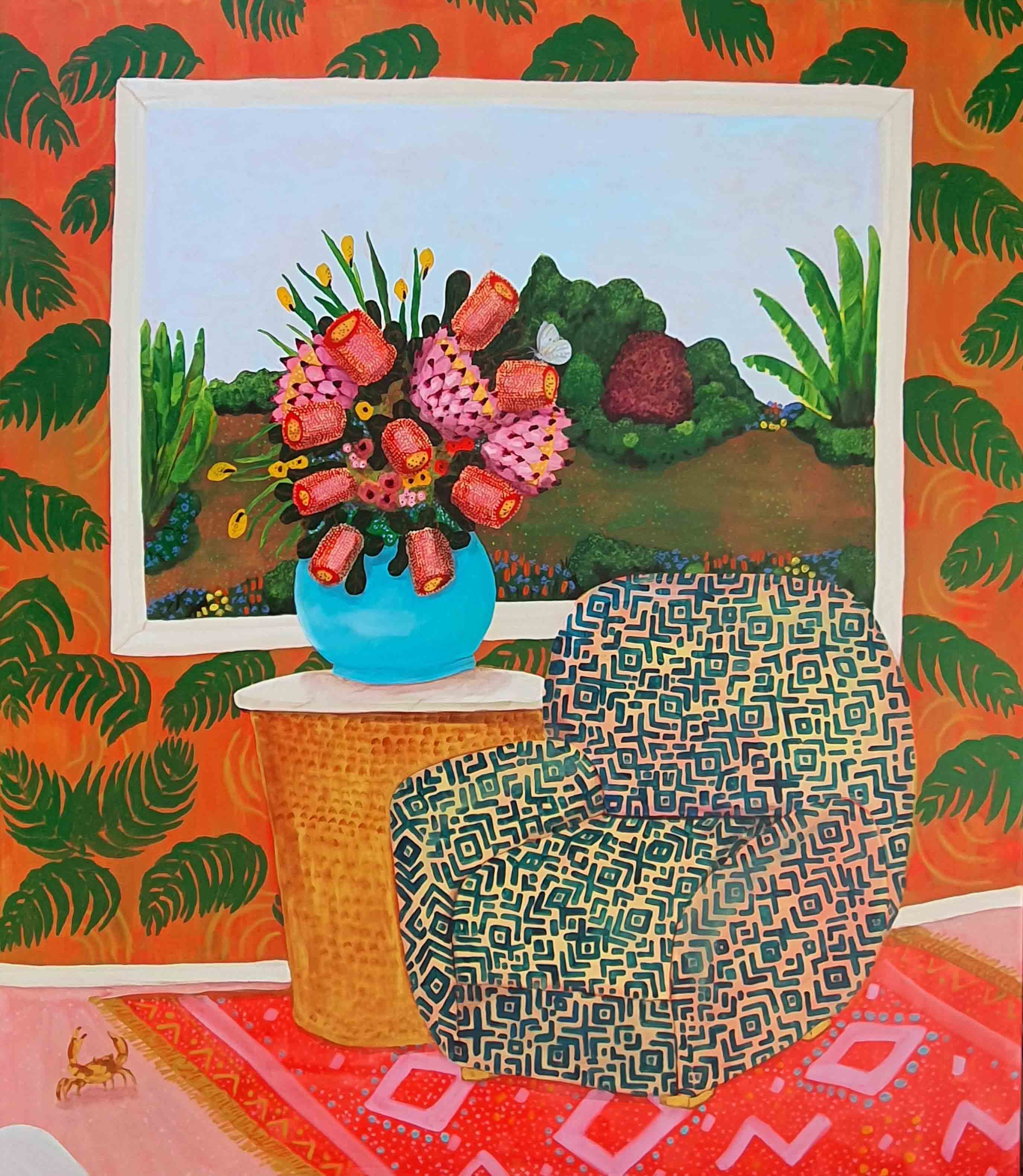 Erica works in acrylic, often painting whimsical scenes from homely spaces, lush landscapes, floral still-life to portraiture. Pieces, generally designed to express joy or reflect moods often containing reference to personal experiences, as well as concerns for humanity, our environment, and the treatment of animals. Pieces infused with pattern, a sense of narrative and colour. part imagined – part life, all painted in her own naive style. Solo exhibitions include life@home,life.e.quatic, The Skin We Are In, Rubber Gloves, Sharp Teeth and Other Pointy Bits and PIPE DREAMS . My work has been a finalist in numerous painting exhibitions among the Adam Portraiture Award 2022 @ New Zealand Portrait Gallery, semi-finalist in the Doug Moran National Portrait Prize 2019 and 2013, in 2015 Hurford Hardwood Portrait Prize as well as a finalist in The Glencore Percival Portrait Painting Prize 2014, 2016, 2018, 2020 and 2022.