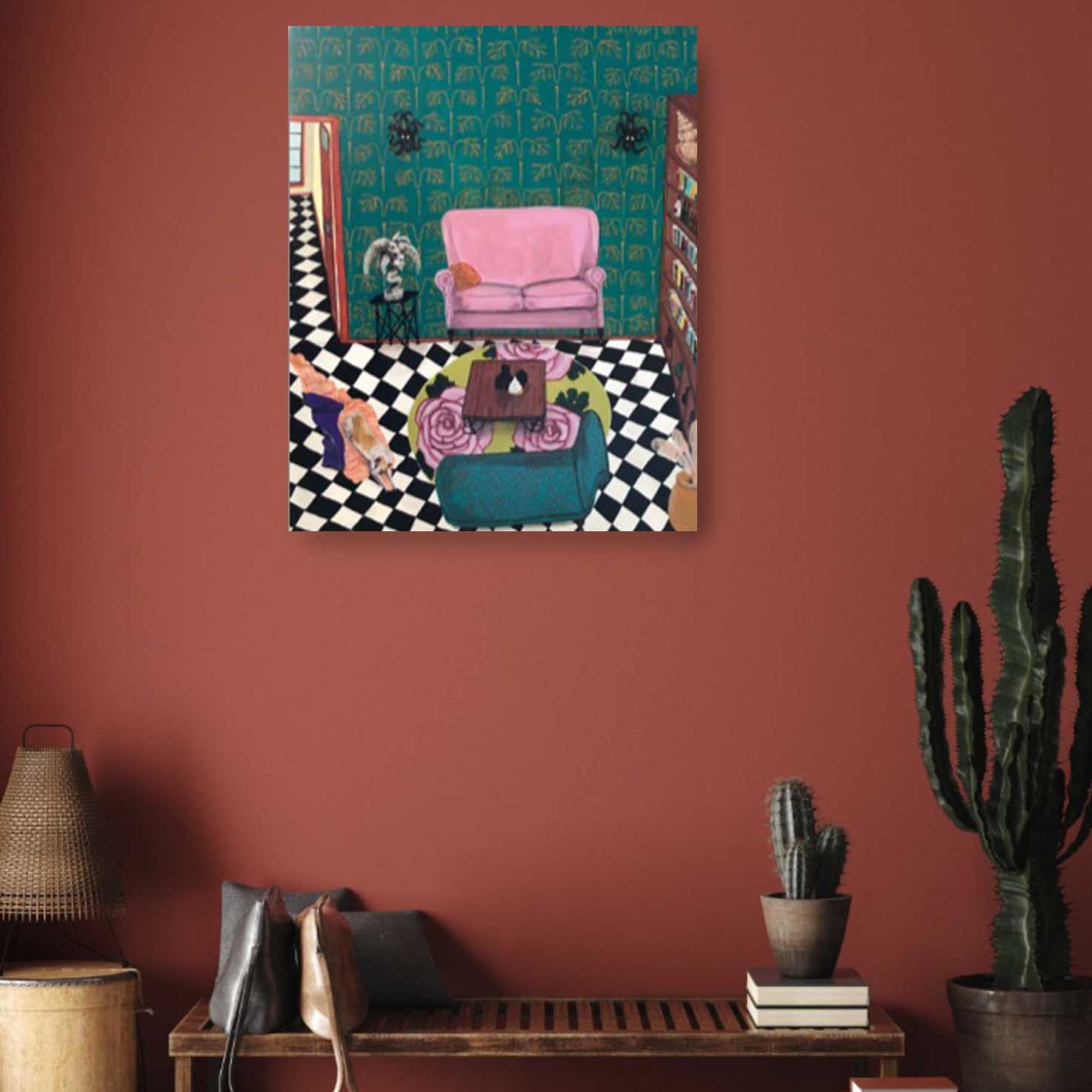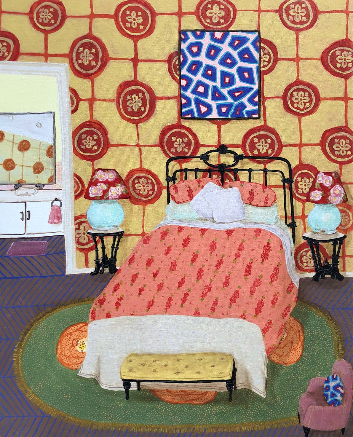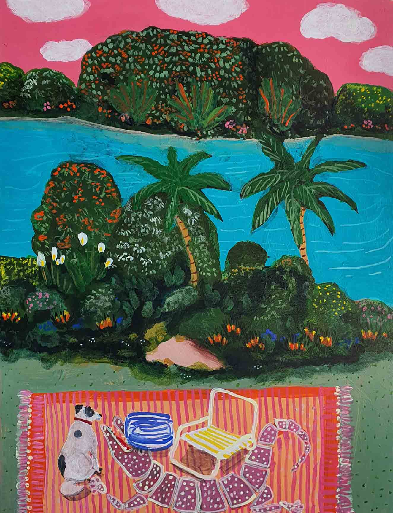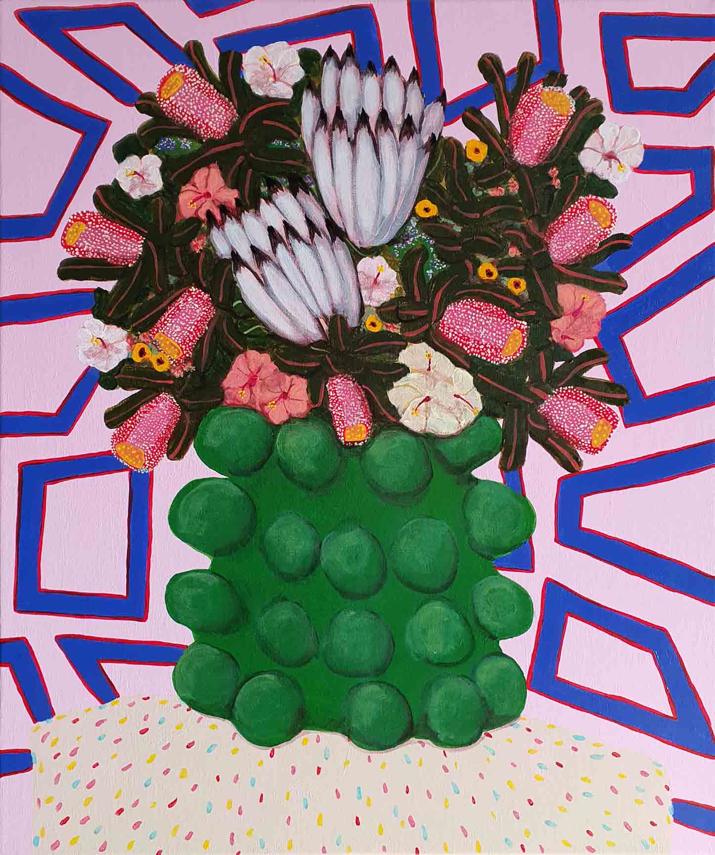 Erica works in acrylic, often painting whimsical scenes from homely spaces, lush landscapes, floral still-life to portraiture. Pieces, generally designed to express joy or reflect moods often containing reference to personal experiences, as well as concerns for humanity, our environment, and the treatment of animals. Pieces infused with pattern, a sense of narrative and colour. part imagined – part life, all painted in her own naive style. Solo exhibitions include life@home,life.e.quatic, The Skin We Are In, Rubber Gloves, Sharp Teeth and Other Pointy Bits and PIPE DREAMS . My work has been a finalist in numerous painting exhibitions among the Adam Portraiture Award 2022 @ New Zealand Portrait Gallery, semi-finalist in the Doug Moran National Portrait Prize 2019 and 2013, in 2015 Hurford Hardwood Portrait Prize as well as a finalist in The Glencore Percival Portrait Painting Prize 2014, 2016, 2018, 2020 and 2022.