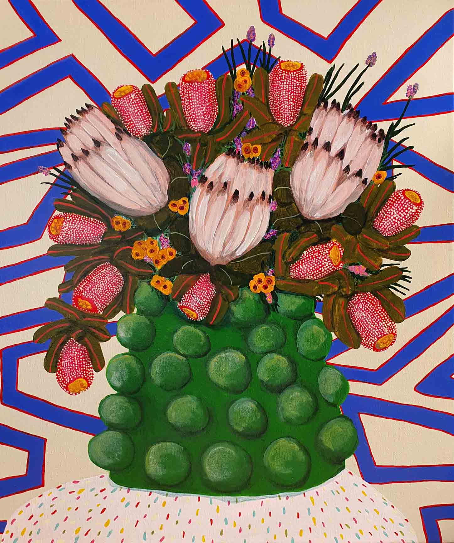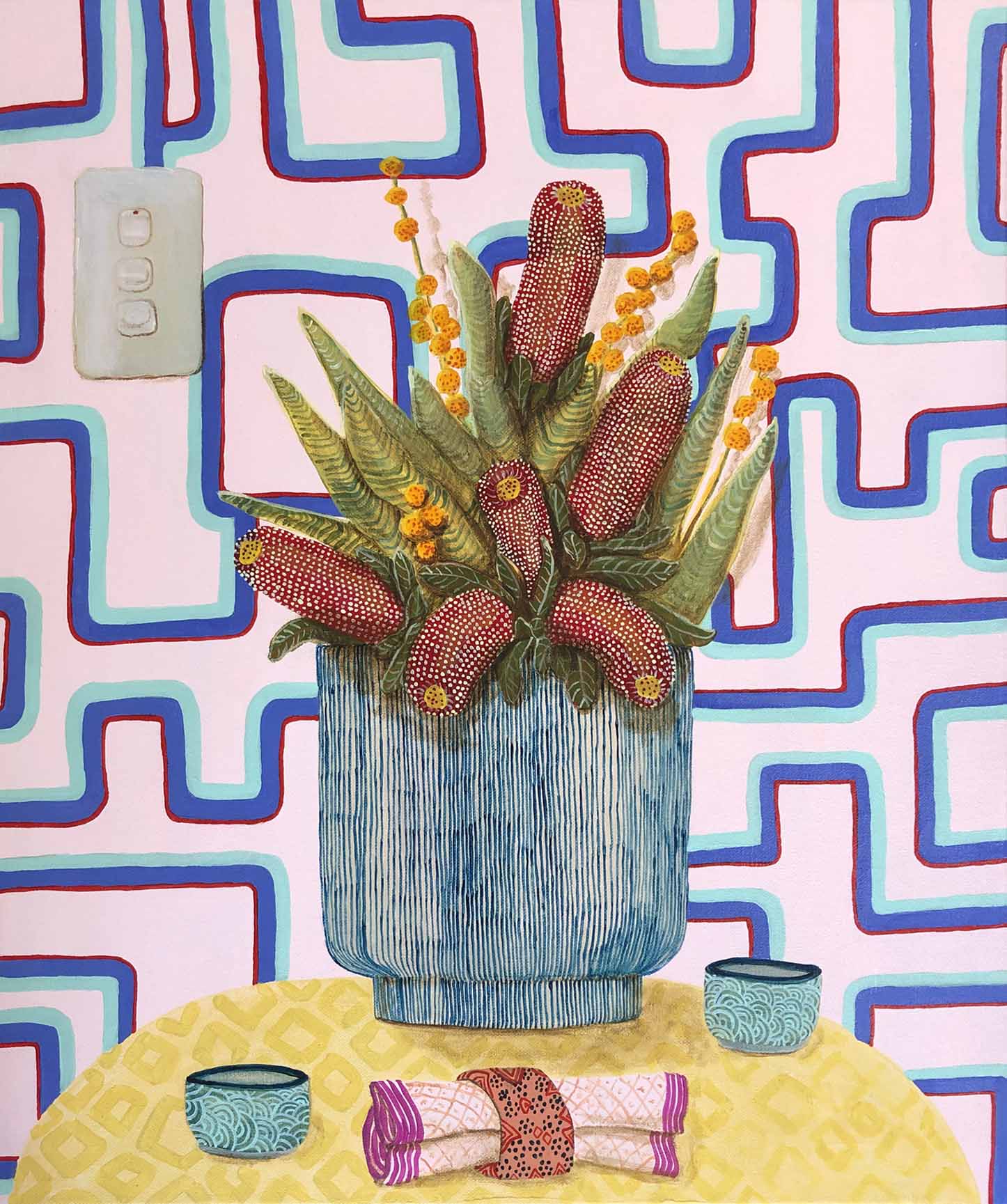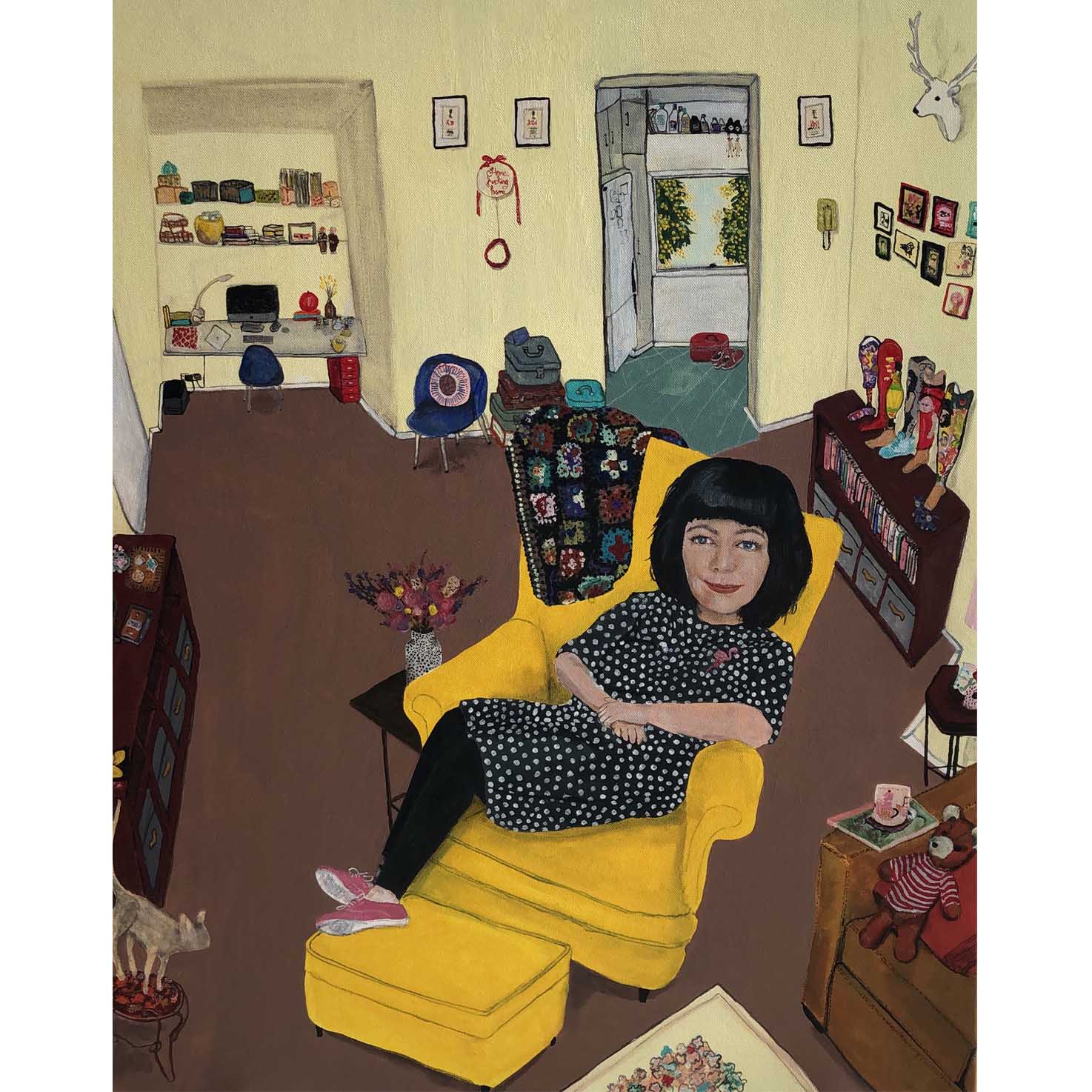 Erica works in acrylic, often painting whimsical scenes from homely spaces, lush landscapes, floral still-life to portraiture. Pieces, generally designed to express joy or reflect moods often containing reference to personal experiences, as well as concerns for humanity, our environment, and the treatment of animals. Pieces infused with pattern, a sense of narrative and colour. part imagined – part life, all painted in her own naive style. Solo exhibitions include life@home,life.e.quatic, The Skin We Are In, Rubber Gloves, Sharp Teeth and Other Pointy Bits and PIPE DREAMS . My work has been a finalist in numerous painting exhibitions among the Adam Portraiture Award 2022 @ New Zealand Portrait Gallery, semi-finalist in the Doug Moran National Portrait Prize 2019 and 2013, in 2015 Hurford Hardwood Portrait Prize as well as a finalist in The Glencore Percival Portrait Painting Prize 2014, 2016, 2018, 2020 and 2022.