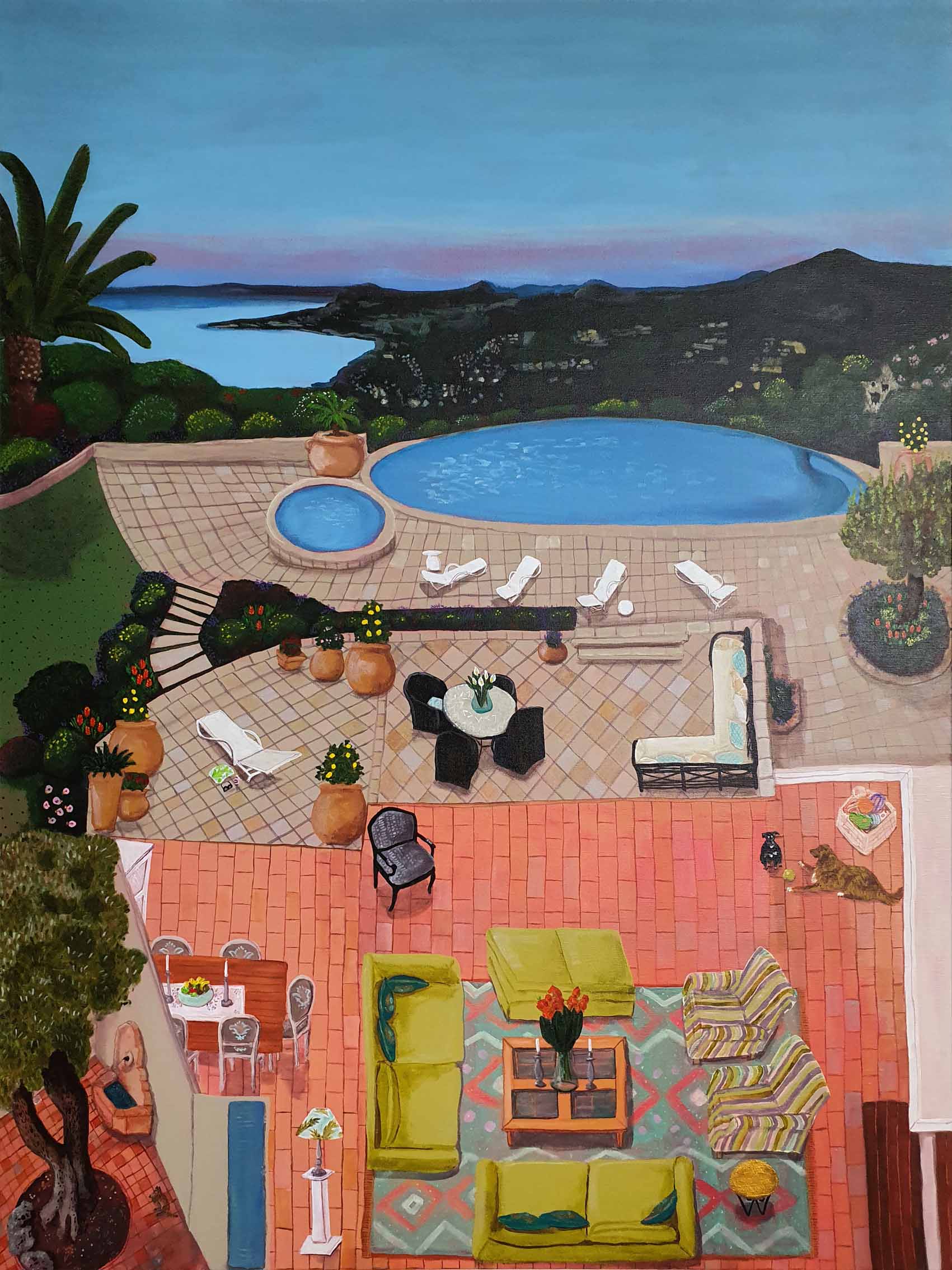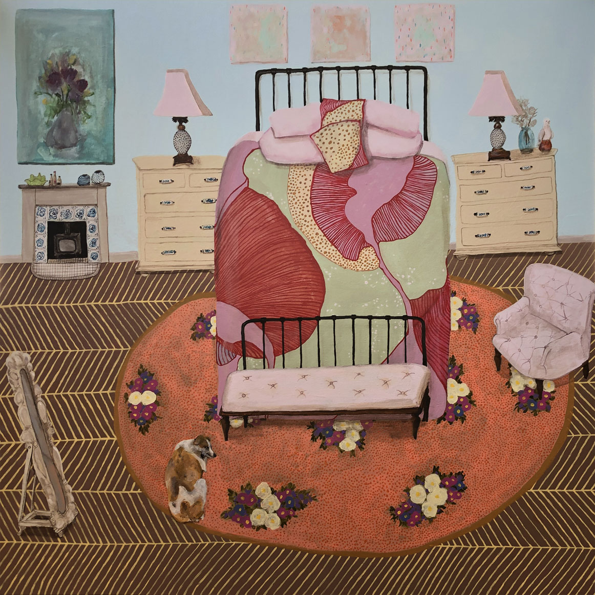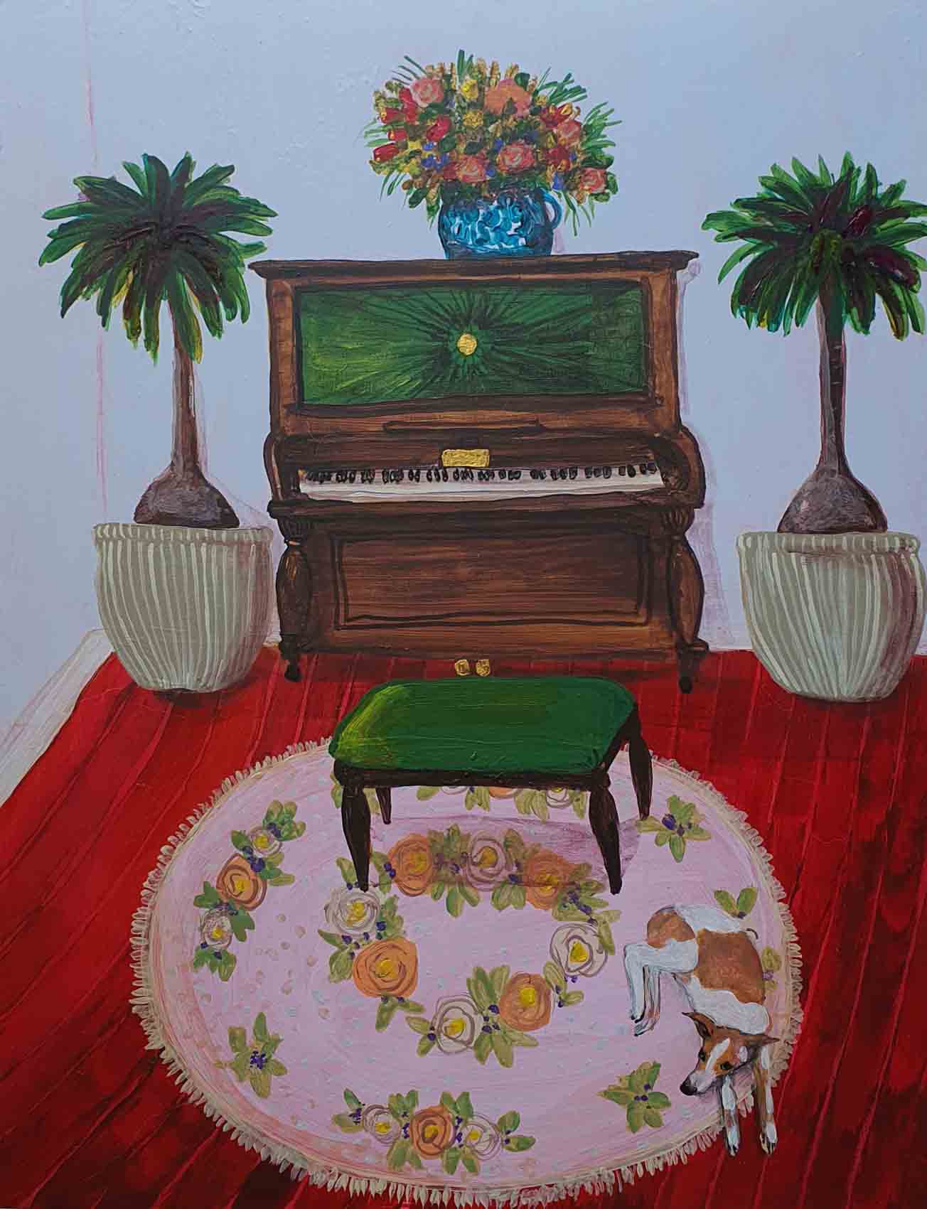 Erica works in acrylic, often painting whimsical scenes from homely spaces, lush landscapes, floral still-life to portraiture. Pieces, generally designed to express joy or reflect moods often containing reference to personal experiences, as well as concerns for humanity, our environment, and the treatment of animals. Pieces infused with pattern, a sense of narrative and colour. part imagined – part life, all painted in her own naive style. Solo exhibitions include life@home,life.e.quatic, The Skin We Are In, Rubber Gloves, Sharp Teeth and Other Pointy Bits and PIPE DREAMS . My work has been a finalist in numerous painting exhibitions among the Adam Portraiture Award 2022 @ New Zealand Portrait Gallery, semi-finalist in the Doug Moran National Portrait Prize 2019 and 2013, in 2015 Hurford Hardwood Portrait Prize as well as a finalist in The Glencore Percival Portrait Painting Prize 2014, 2016, 2018, 2020 and 2022.